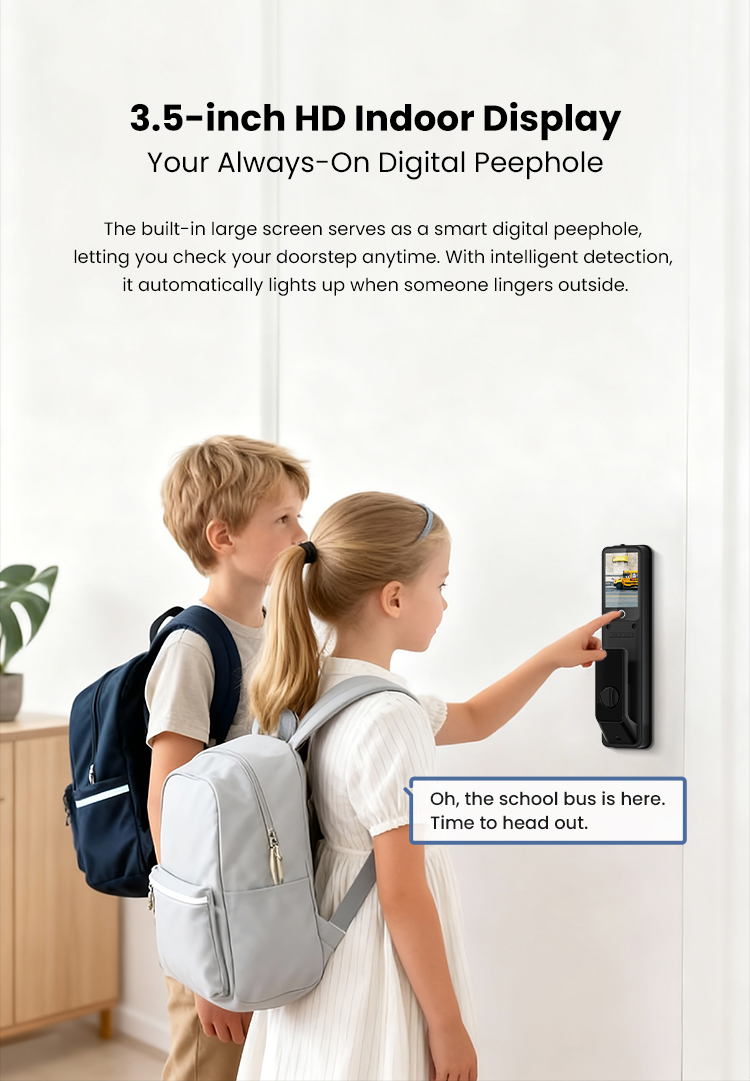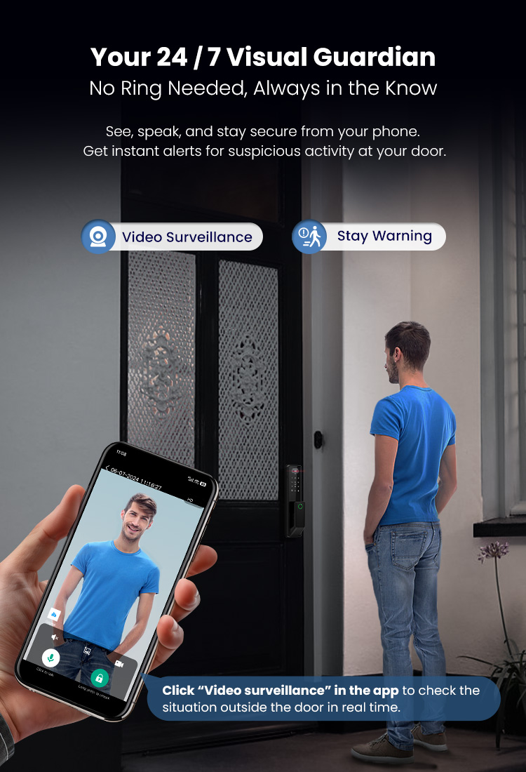 ➡️【Motion Detection】 When someone stays in front of the door for too long, the lock will sound an alarm and send relevant video to the APP