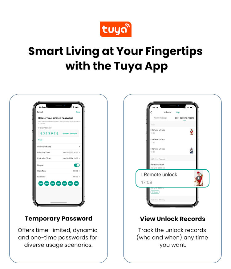 ➡️【Temporary Password】Can set temporary passwords (including Limited Time, Single Time, and Dynamic Password) through the Tuya APP.